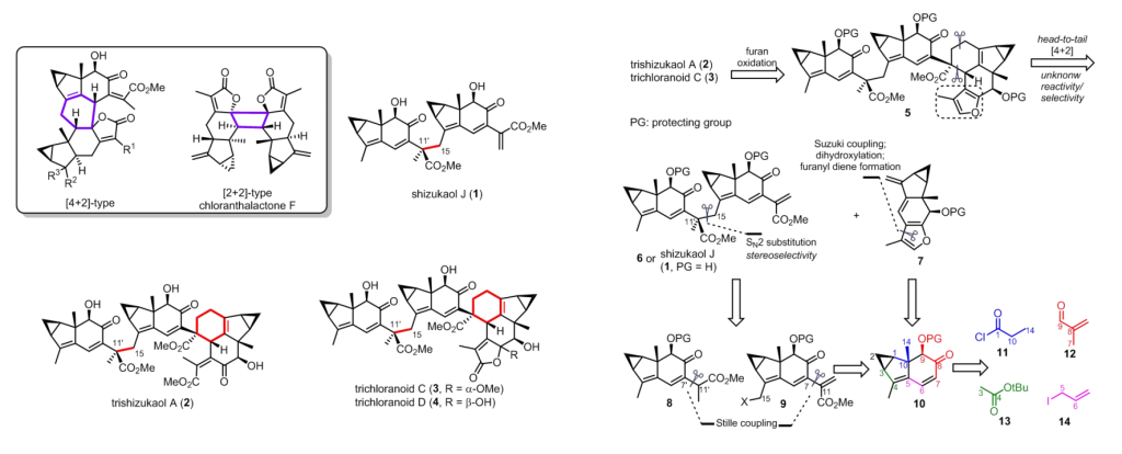 乌药烷型倍半萜及其多聚体作为金粟兰科植物代表性的天然产物,在抗菌、抗炎、抗肿瘤及抗HIV方面表现出良好的生物活性。其多聚体结构复杂多样,吸引了众多化学家的合成研究。迄今为止,已有赵刚、彭小水以及刘波课题组关于[4+2]及[2+2]型二聚体天然产物的全合成报道。然而,还有一类以C11′–C15相连接的二聚体shizukaol J (1)和三聚体trishizukaol A (2)、trichloranoids C (3)及trichloranoids D (4)未有合成报道。生物活性研究表明trishizukaol A和trichloranoids D表现出微摩尔级的抗疟活性。因此,完成上述天然产物的不对称全合成,对于丰富乌药烷倍半萜多聚体全合成领域,以及后续的药物研发具有重要意义。