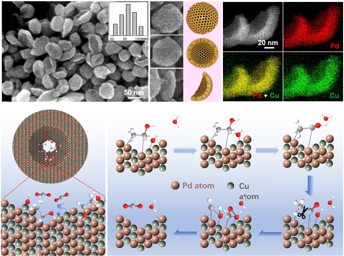 该SMP具有丰富的不饱和配位点、优化的电子结构、出色的电子/质量转移和受限的介孔环境。与对应的商业催化剂Pd/C 相比,弯曲的 PdCu SMP 表现出显著增强的电催化乙醇氧化活性和稳定性。同时,PdCu SMPs 对 EOR 电催化具有更高的催化选择性;可显着促进乙醇分子中的 C-C 键断裂,具有高达72%的优异碳一途径选择性。