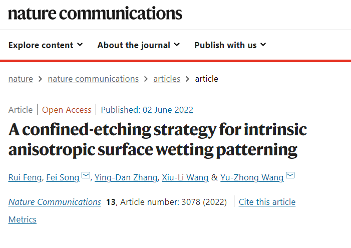 近日,我院王玉忠院士和宋飞教授在Nature Communications上发表题为“A Confined-Etching Strategy for Intrinsic Anisotropic Surface Wetting Patterning”的研究论文(Nat. Commun. 2022, 13, 3078)。四川大学为论文唯一署名单位,化学学院环保型高分子材料国家地方联合工程实验室2019级博士研究生冯蕊为论文第一作者,王玉忠教授和宋飞教授为通讯作者。