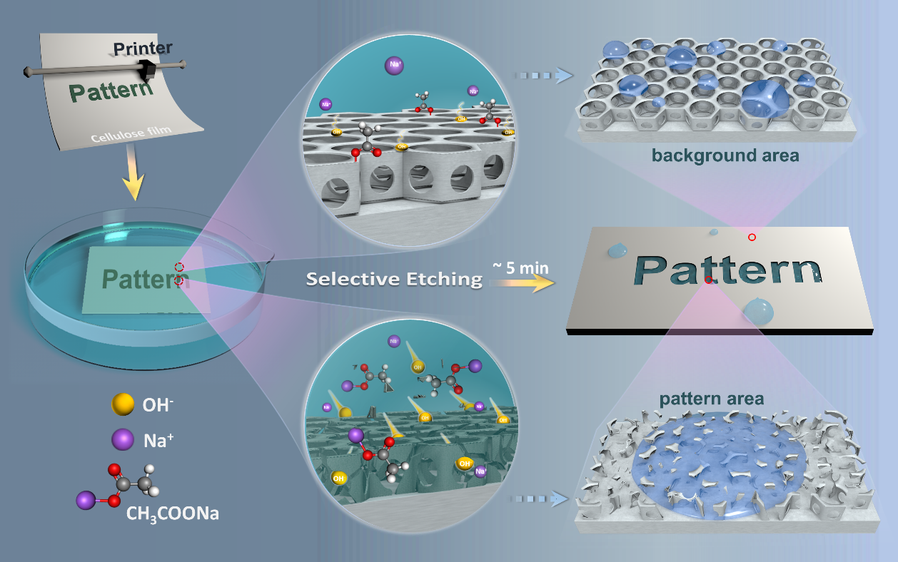 由我院王玉忠院士创建的环保型高分子材料国家地方联合工程实验室,长期从事生物基与生物降解高分子材料的基础与应用研究工作。该团队受可降解高分子材料分解过程因化学和物理结构改变导致材料表面润湿性变化所启发,提出了一种可控限域化学刻蚀策略,仅利用普通商用喷墨打印机即可实现精确、复杂图案化润湿差异表面的简单、快速制备(例如二维码图案)。通过三醋酸纤维素在NaOH水溶液中的脱乙酰降解反应,结合水滴模板法与喷墨打印技术,在三醋酸纤维素多孔表面成功实现差异化碱刻蚀,从而制备了具有本征润湿差异的图案化表面。表面图案区域与非图案区域具有明显润湿差异性,并且表面润湿性与微观形貌可通过控制脱乙酰化程度予以调控。制备的图案化表面在响应型信息存储与加密、柔性电子器件的制备等领域展现出良好的应用前景。