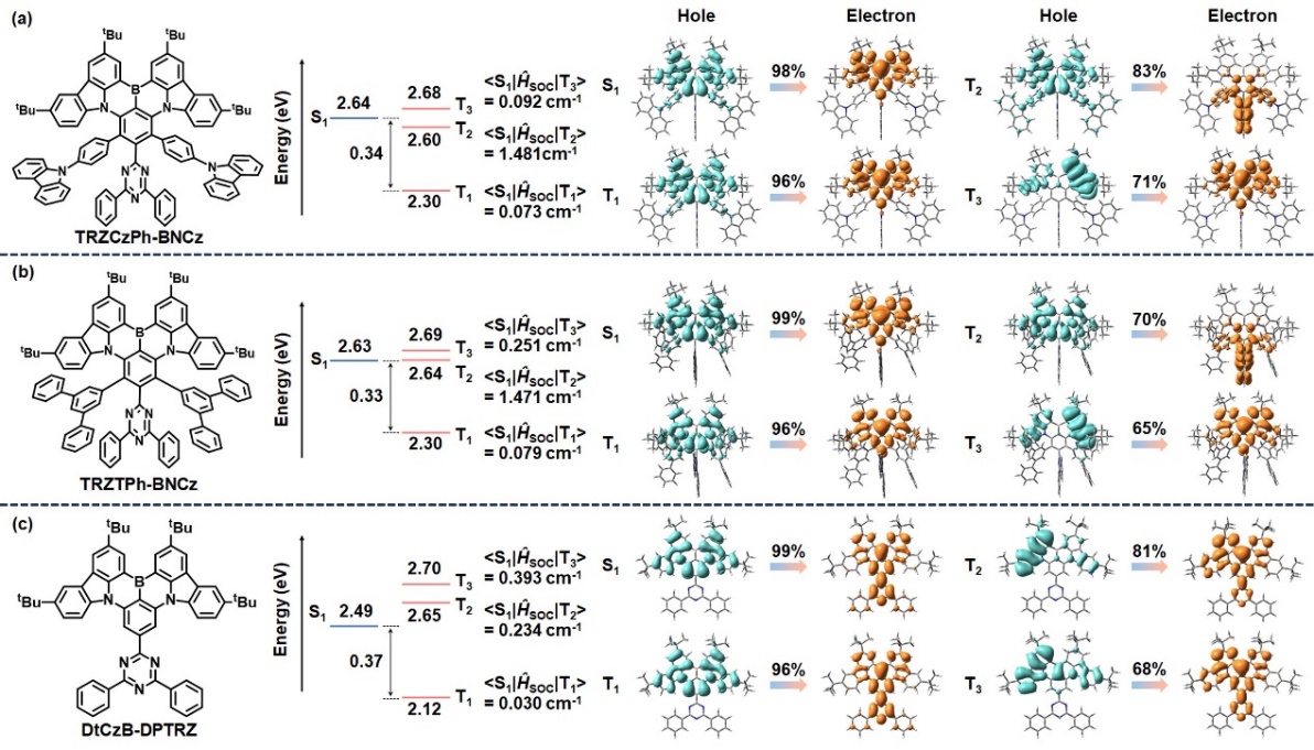 近日,四川大学游劲松教授、宾正杨副研究员团队发展了一种基于“空间限制的给受体”策略以提高MR-TADF分子kRISC,在保持较窄发光半峰宽的前提下,成功将MR-TADF分子的kRISC提高至106 s-1。在分子DtCzB-DPTRZ的基础上,基于“空间限制的给受体”策略发展了新型MR-TADF分子TRZCzPh-BNCz和TRZTPh-BNCz。理论计算研究发现,通过引入空间限制的给受体基团,可以降低MR-TADF分子的T2和T3能级,进而使其接近S1能级,从而打开了从中间的T2/T3态到S1态的高效上转换通道。同时,通过引入空间限制的给受体基团,TRZCzPh-BNCz和TRZTPh-BNCz的S1态的跃迁特征与其T2或T3态的跃迁特征有较大的差异,造成其自旋轨道耦合SOCS1-T2和SOCS1-T3相对较大,使得激子从T2或T3态的反系间窜越过程更加高效,最终将kRISC从DtCzB-DPTRZ的103 s-1数量级提升到TRZCzPh-BNCz和TRZTPh-BNCz的106 s-1数量级。