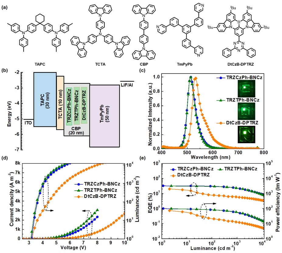 多重共振类延迟荧光分子(MR-TADF)具有较窄的发光半峰宽和较大的辐射跃迁速率,因此基于该类发光分子的OLED能够实现较好的色纯度和较高的外量子效率(EQE),有望成为下一代OLED发光材料的突破点。然而,目前该类材料分子通常存在反系间窜越速率(kRISC)较低的问题,造成器件效率滚降比较严重。因此,开发具有高kRISC的MR-TADF分子并改善其OLED效率滚降具有重要的研究和产业化意义。