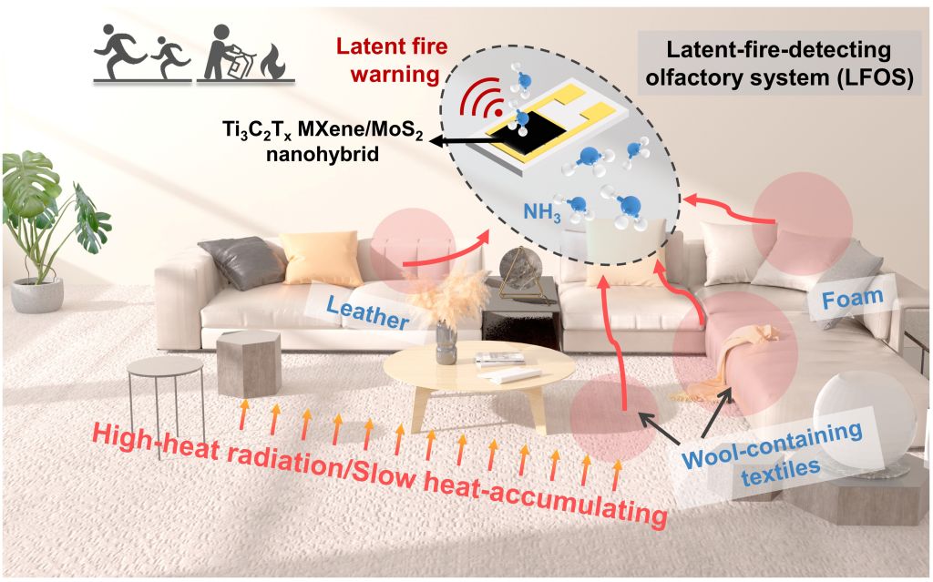 团队利用二维材料Ti3C2Tx MXene与MoS2构筑肖特基异质结,设计制备了具有超快响应速度(3 s @100 ppm),低检测限(最低检测浓度200 ppb),高灵敏度(81.7% @100 ppm和10.2% @200 ppb)的高性能氨气传感材料,并构建火灾探测器件(latent-fire-detecting olfactory system, LFOS);进一步以自制的潜伏期火灾模拟装置,构建缓慢升温分解和暴露于高热辐射分解的潜伏期火灾场景(图3),研究LFOS对典型可燃材料(羊毛与泡沫,常用于纺织品和建筑内墙)的响应性能。相较于商用氨气探测器和烟雾探测器,LFOS能快速的检测到火灾的威胁,实现了潜伏期火灾预警。
