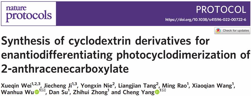 近日,我校化学学院杨成、伍晚花团队在《Nature Protocols》杂志上发表了题为Synthesis of cyclodextrin derivatives for enantiodifferentiating photocyclodimerization of 2-anthracenecarboxylate的论文,报道了环糊精衍生物介导的2-蒽酸手性光二聚反应的设计和研究。