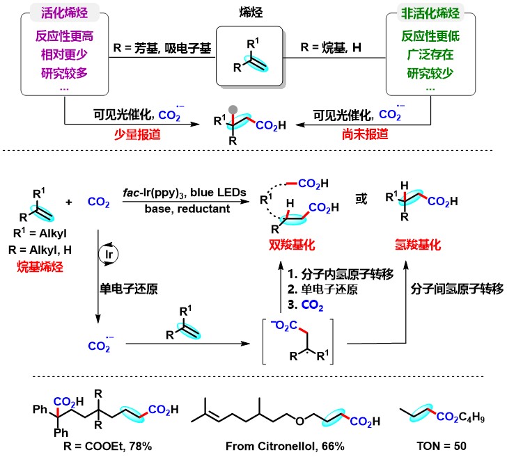 二氧化碳(CO2)是一种对气候变化有重要影响的温室气体,也是一种储量丰富、廉价易得、无毒且可再生的碳一资源。利用CO2参与化学转化,高效规模化制备高附加值化学品和大宗化学品,是服务国家重大战略需求的重要方式,对促进资源开发和可持续发展具有重要意义。其中,利用CO2精准合成在医药和材料等领域有重要应用的羧酸及其衍生物,是合成化学领域的重要研究方向,虽然已有可喜进展,但仍然存在很多问题。另一方面,太阳能是取之不尽用之不竭的清洁能源,可见光催化具有绿色环保、条件温和以及官能团兼容性高等特点,因此备受关注。考虑到烯烃来源广泛,近年来,人们利用可见光催化烯烃与CO2反应,实现了一系列具有不同化学和区域选择性的羧基化反应,合成了多种类型的重要羧酸产物。然而,在已报道的例子中,底物主要局限于活化烯烃(例如芳基乙烯和丙烯酸酯)。相比而言,非活化烯烃由于反应性更低,通常比活化烯烃更难与CO2发生羧基化反应。因此,开发一种新策略来实现可见光催化非活化烯烃和CO2的羧基化反应具有重要意义。