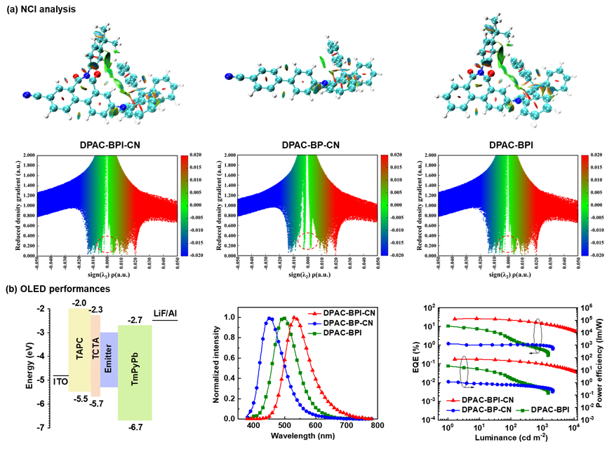 近日,游劲松教授和宾正杨副研究员等,发展了一种分子内中环锁策略,构筑适用于非掺杂OLED的高性能TADF发光材料。通过苯甲酸自偶联反应,对常用的苯氰受体进行改造,研究发现在联苯骨架上引入二酰亚胺结构,不仅通过共价键锁住了苯氰受体和苯桥,同时通过NCI(nonbonding covalent interaction)分析发现9,10-二氢-9,9-二苯基吖啶电子供体与电子受体之间存在增强的非共价键弱相互作用力,这使得分子刚性进一步增强,有利于提高分子的发光效率。此外,分子内中环锁的引入可以使分子产生聚集诱导发光(AIE)和聚集诱导延迟荧光(AIDF)性质,从而在纯膜中获得较高的量子产率(PLQY,90.1%)。此外,缺电的分子内中环锁的引入也可以显著降低∆EST(0.07 eV),并提高分子水平取向(83%)。最终,DPAC-BPI-CN展现出优异的电致发光性能,在非掺杂OLED实现了26.2%的外量子效率。值得一提的是,在本论文中,作者通过对溴苯甲酸与苯甲酰胺的交叉偶联反应,一步高效构筑了含单一供体的七元环BPI分子骨架,大大缩短合成路线,为进一步衍生提供了便利,也展现出交叉偶联反应在构筑具有不对称结构的OLED材料中的独特魅力。