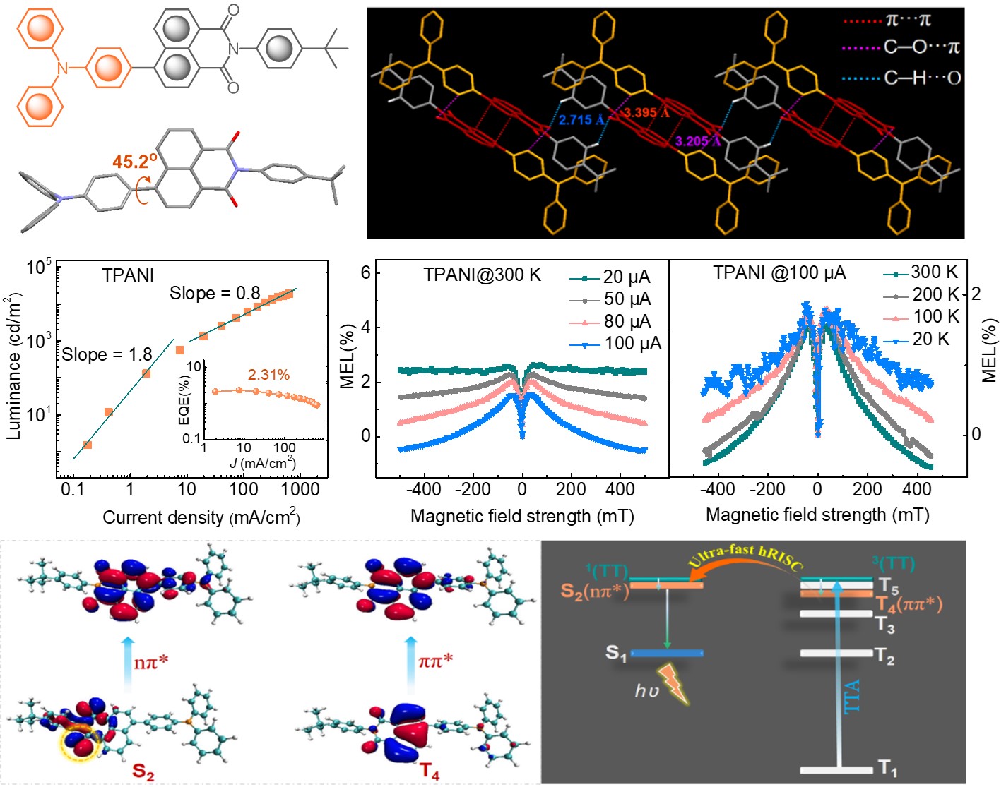 近日,卢志云教授团队在Nature Communications上发表了相关研究工作进展,指出如能赋予分子以三线态通道的三线态-三线态湮灭(TTA)能力(即:T1 + T1 → Tn + S0),则OLED中经电注入所产生的3ππ*T1“冷”激子便可高效转化为高能量的3ππ*Tn激子(能量甚至可超过4.0 eV);如若化合物同时还拥有与Tn接近的1nπ*能级,则可借助3ππ*→1nπ*的超快hRISC过程(SOCME: 接近10 cm-1khRISC: >109 s-1),将Tn激子有效转化为单线态激子,从而对OLED中的T1“冷”激子实现有效利用。他们以TPANI为实验示例验证了上述结论,发现在基于TPANIOLED中,通过nπ*助力的TTA介导的hRISC过程的激子利用率可超过10%。这一研究工作有望能加深人们对三线态通道TTA过程的认知、唤醒人们对nπ*型激发态的关注,为开发高性能hRISC-OLED材料提供了新思路。