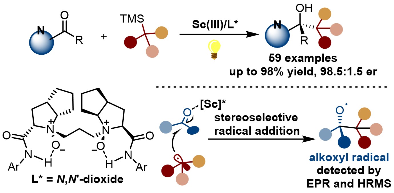 近日,冯小明教授和曹伟地教授团队报道了路易斯酸促进光催化酮的不对称自由基加成反应。在该反应中,原位形成的手性双氮氧/钪(III)-酮络合物用作瞬态光催化剂,可以与硅烷发生单电子转移,生成烷基自由基物种,对含氮杂环酮进行亲核加成。该反应具有条件温和、底物适用性广和官能团兼容性好等优点。一系列烷基硅试剂,包括一级、二级、三级碳自由基前体的烷基硅试剂都能较好地参与该反应,以中等至优秀的产率和对映选择性得到一系列手性叔醇类化合物。值得一提的是,该反应可高对映选择性的一步合成组胺拮抗剂前体。作者对该反应的反应机理进行了详细的研究,其中电子顺磁共振(EPR)和高分辨质谱(HRMS)等实验监测到了氧自由基和碳自由基,证实了自由基加成历程的存在。