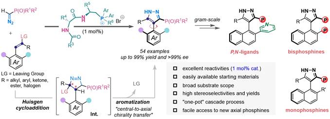 近日,我院王天利教授团队以多功能手性肽季鏻盐作为催化剂,首次利用不对称Huisgen环化/芳构化的串联反应实现了一系列轴手性芳基-吡唑含膦化合物的高效不对称合成。该反应是通过Huisgen类型的环加成和碳中心手性-轴手性转变的芳构化过程进行,且仅需1 mol%的催化剂负载量就能以高产率、优秀的对映选择性获得一系列芳基-吡唑轴手性膦化合物,该反应为快速构建基于吡唑的轴手性芳基膦化合物提供了新方法。最后将产物进行简单的转化制备单/双膦轴手性配体,将其应用于钯催化不对称烯丙基化和胺化中,并取得优秀的分离收率和高的对映选择性;同时,铑催化不对称芳基硼酸的1,4-加成也取得较满意的结果。机理研究表明,产物立体控制的关键在于反应产生了鏻盐稳定重氮膦酸酯阴离子的手性环境和具有多个氢键稳定的手性半封闭腔结构。