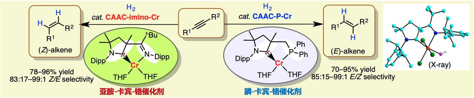 烯烃是重要的化工原料,被广泛应用于合成聚合物、医药、农药及材料分子。炔烃的半氢化还原是制备烯烃的重要手段。工业上常使用以钯为催化物种的林德拉催化剂,但需要以醋酸铅或喹啉为毒化试剂实现炔烃的半氢化合成顺式烯烃。如果以自然界储量大、价格低廉的丰产金属为催化剂替代贵金属钯、以两种不同的配体来调控炔烃半加氢的顺/反立体选择性,有可能在不使用毒化试剂的前提下,开发出经济的丰产金属催化策略制备顺式或反式烯烃,实现炔烃半加氢的立体选择性调控。