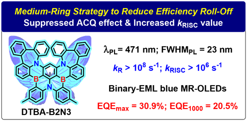 近日,四川大学游劲松教授和宾正杨教授团队发展了一种“中环”策略以抑制MR-TADF分子堆积,并进一步提高MR-TADF分子的kRISC。在保持窄发光半峰宽的前提下,该团队成功发展了一种兼具高kRISC(>106 s-1)和高kR(>108 s-1)的蓝光MR-TADF分子DTBA-B2N3,有效抑制分子聚集产生的光谱展宽和发光淬灭,从而获得高效率和低效率滚降的蓝光窄光谱OLED。