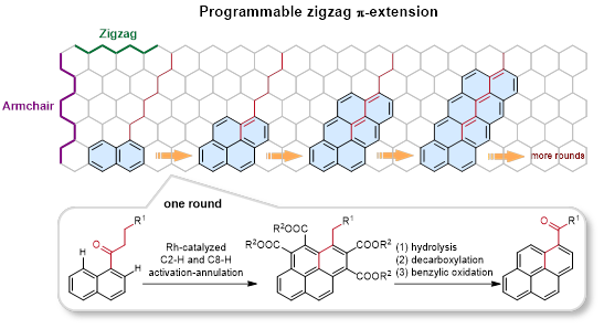 近年来,四川大学游劲松教授团队基于酮羰基的弱配位能力及酮-烯醇互变现象,已经发展了一系列具有鲜明研究特色的烷基芳基酮与炔烃之间的C‒H键活化/环化反应,构筑了结构多样的纯碳及氧鎓掺杂的多环芳烃分子(Angew. Chem. Int. Ed., 2021, 60, 12371;Angew. Chem. Int. Ed., 2019, 58, 302;Nat. Commun., 2019, 10, 5664;Angew. Chem. Int. Ed. 2017, 56, 13094;Angew. Chem. Int. Ed., 2017, 56, 4286;Nat. Commun., 2014, 5, 5030)。基于这些研究基础,近日,我院游劲松教授提出了一种基于碳氢键环化反应实现精准可控的锯齿形类石墨烯分子的高效构筑及定向π-拓展的合成策略。通过利用1-萘酮类化合物为底物,与丁炔二酸酯的顺序的C2‒H和C8‒H活化/环化反应,可以实现萘结构单元的高效构筑及沿着酮烷基链方向迭代延伸,进而实现锯齿形π体系拓展。该策略为可控合成结构多样的锯齿型类石墨烯分子提供了一种简洁、高效的合成途径。基于控制实验和DFT计算,作者提出了该反应的可能路径,即串联的[4+2]/[4+2]C‒H键活化/环化反应。值得注意的是,传统的芳香酮类与炔的C‒H键活化/环化反应通常经过亲电加成或还原消除生成茚醇、富烯和吡喃鎓等产物,而该反应是经过芳香酮的C(sp3)–H的环化实现萘结构单元的构筑与定向生长。环化产物经过简单的水解、缩合等反应,能够得到一类新颖的酰亚胺结构。有机薄膜晶体管(OTFT)和热激活延迟荧光(TADF)等性能测试表明,该策略在制备高性能OTFT和OLED材料中的具有较大潜力。