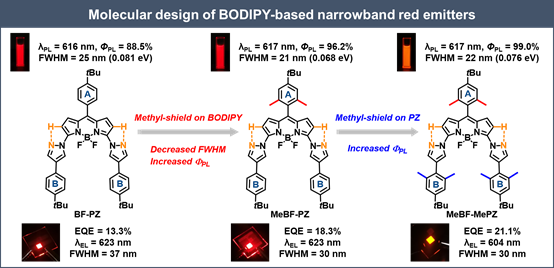 研究表明,在BODIPY骨架上引入吡唑(PZ)单元,在获得显著红移发射的同时,由于分子内氢键抑制PZ单元的旋转,从而获得了窄光谱红色荧光材料BF-PZ,其在甲苯溶液中发射波长为616 nm,发射半峰宽(FWHM)为25 nm,光致发光量子效率(ΦPL)为88.5%。在BODIPY骨架的meso-苯基(A环)引入两个甲基(MeBF-PZ),不仅抑制了A环的旋转以降低FWHM至21 nm,而且增加了A环与BODIPY母核间的二面角,以抑制BODIPY发光母核间的堆积,从而减小聚集淬灭发光,使ΦPL提高至96.2%。此外,在PZ单元的苯环(B环)上进一步引入甲基(MeBF-MePZ),可使ΦPL提高至99.0%。