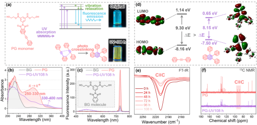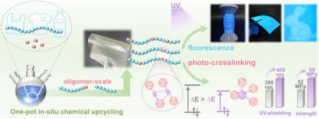 近期,该团队提出了一种绿色无溶剂的废旧PET化学升级回收制备抗紫外功能材料的新策略,即反应型二苯乙炔功能单体通过微醇解和再聚合的一锅酯交换反应原位共聚到废旧PET的大分子链中。二苯乙炔基团吸收短波高能紫外线,然后释放长波低能荧光;同时,紫外线诱导的二苯乙炔基团之间的化学光交联反应产生扩展的π-共轭体系,导致紫外线吸收带发生红移(由于HOMO-LUMO间隙减少)并形成PET链之间的化学交联点(增加了链间相互作用力)。因此,随着高强度紫外线辐射时间的增加,升级回收PET表现出“反向增强”(即不降反升)的抗紫外线能力和拉伸强度,突破了传统高分子材料在长时间紫外线照射下不可避免的发生光降解和性能下降的难题。