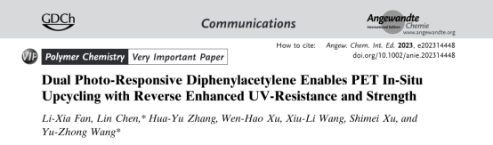 该工作以“Dual Photo-Responsive Diphenylacetylene Enables PET In-Situ Upcycling with Reverse Enhanced UV-Resistance and Strength”为题发表在《Angew Chem Int Ed》(2023, e202314448),并被遴选为VIP论文(Very Important Paper)。四川大学为第一单位,第一作者为环保型高分子材料国家地方联合工程实验室的硕士范丽霞,通讯作者为陈琳研究员和王玉忠院士,研究得到国家重点研发计划(2021YFB3700203)和111计划(B20001)等资助。