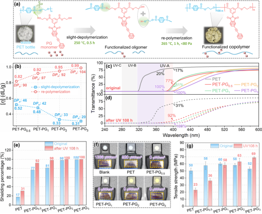 图2. 废旧PET的原位化学升级回收与抗紫外性能