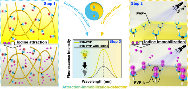 基于此,化学学院何玲团队设计了一种基于离子液体的光致发光离子聚亚胺网络(IPIN),与PVP结合作为碘亲和添加剂,制备成IPIN-PVP复合膜材料,用于挥发性碘的现场荧光检测。通过协同利用IPIN的离子诱导吸引效应和PVP对碘的络合效应,提出一种吸引-固定-检测(AID)的荧光传感策略,使IPIN-PVP膜在捕获空气中微量碘方面表现出增强的能力。实验结果表明,优化后的IPIN-PVP对气态碘具有突出的检测性能,同时实现了最快5秒的响应时间和4.087×10-8 M的低检测限。此外,所制备的IPIN-PVP具备良好的柔韧性和自愈合特性,可以被进一步加工成手持式荧光传感设备。该材料的提出为挥发性碘的实时现场检测提供了一种新的解决方案,也为核能发展背景下的环境质量安全监控提供了一种潜在的技术手段。