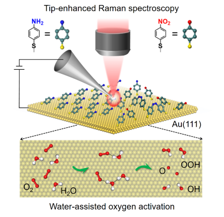 针对上述难题,蔡镇锋课题组基于在“表面反应过程原位表征”方向上的研究基础,与瑞士苏黎世联邦理工学院的Naresh Kumar研究员合作,利用针尖增强拉曼光谱技术(Tip-enhanced Raman spectroscopy,TERS),结合模型体系设计与氧同位素标记策略,成功实现了Au(111)模型催化剂界面上分子氧活化过程的纳米级高空间分辨拉曼光谱研究。研究表明,在大气条件下,分子氧可以在Au(111)表面上发生活化,并将表面上吸附的4-氨基苯硫酚分子(4-ATP)氧化为4-硝基苯硫酚分子(4-NTP)。进一步,结合氧同位素标记策略,将O18标记的H2O18分子引入到反应环境中,发现在氧化形成的4-NTP产物中能检测到O18的存在,验证了分子氧在Au(111)面上的活化过程是一个界面水辅助氧化的机制。该研究在纳米尺度上对Au(111)表面分子氧的活化过程进行了精准表征,提出了界面水辅助分子氧活化机制,对于丰富氧气在金催化剂上的活化理论具有重要意义。