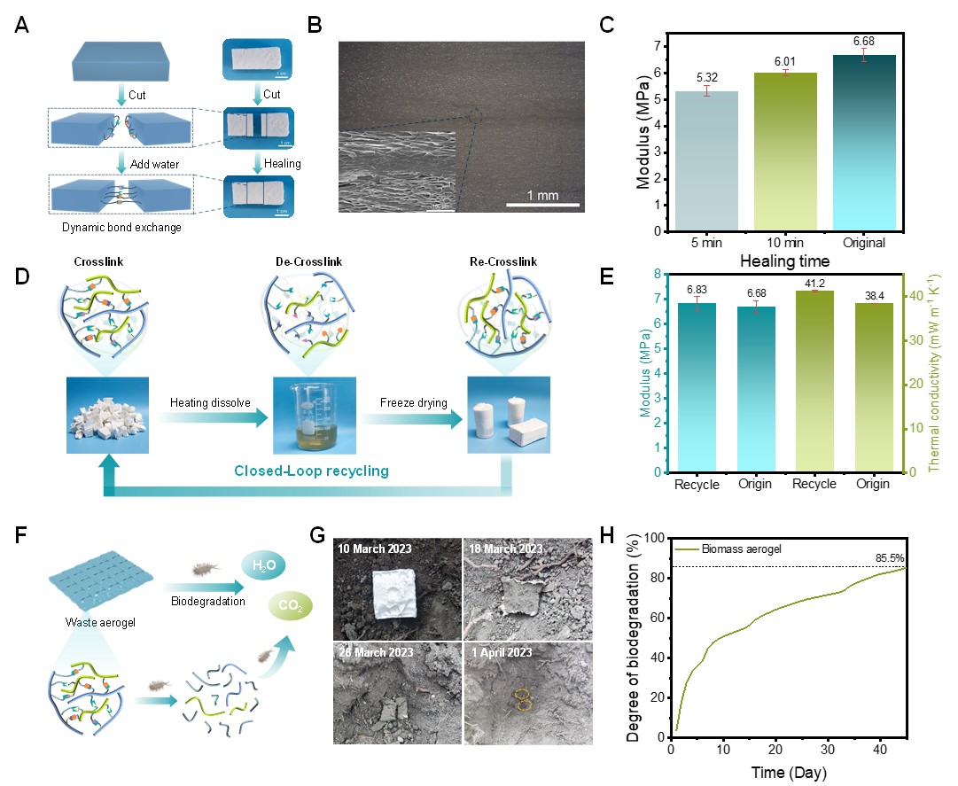 图3 GE-DNA气凝胶的自修复、循环回收和可生物降解性能