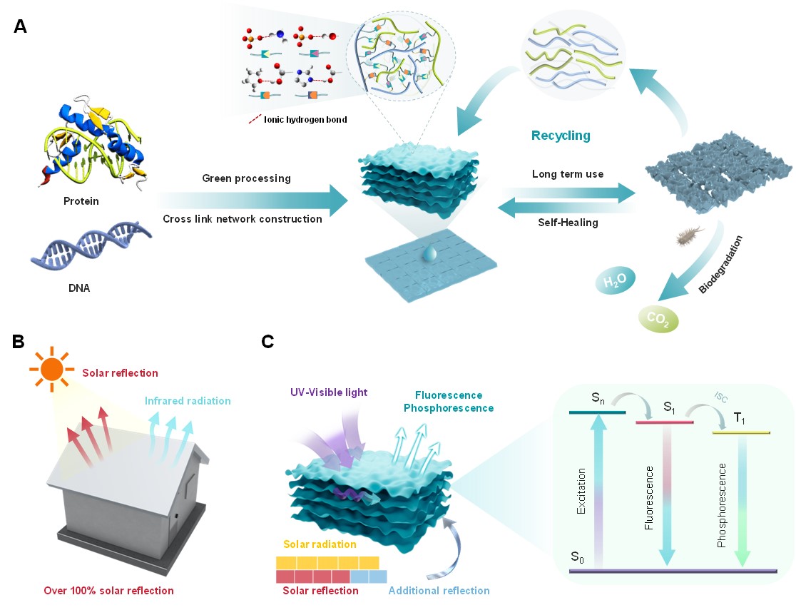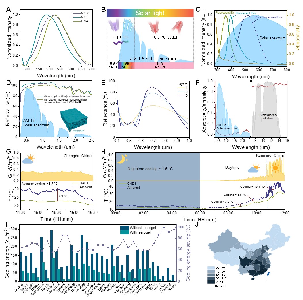 近日,四川大学环保型高分子材料国家地方联合工程实验室王玉忠院士团队赵海波教授提出了一种基于生物质本征光致发光辐射制冷新策略,发展了具有高太阳光反射率、可大规模制备、可循环利用的全生物质辐射冷却气凝胶。研究发现,由明胶和DNA制备的生物质气凝胶具有独特的荧光/磷光特性以及高度有序的层状结构。这种本征光致发光效应使得气凝胶将吸收的紫外光转化为可见光,有效提高气凝胶材料在可见光区域的太阳光加权反射率(太阳光模拟下高达104.0%),大幅增益气凝胶材料的日间辐射冷却效率。该气凝胶在高太阳辐照度的户外条件下,环境温度降低达16.0 ℃,表现出优异的制冷性能。另一方面,利用水介导气凝胶界面处强离子氢键的可逆解离-重构特性,通过可扩展、普适的水焊接策略实现了具有各向异性孔结构气凝胶板的大规模制备,长程有序的孔结构可确保气凝胶材料光学性质及综合性能的可靠性。此外,该全生物质气凝胶材料具有阻燃、可快速自修复、可循环利用和可生物降解等性能,在材料来源、制备、使用及废弃的全生命周期具有高环境友好性。这种可扩展的光致发光生物质冷却气凝胶有望显著减少碳排放和能源消耗,为未来可持续辐射冷却材料的设计制备提供新思路。