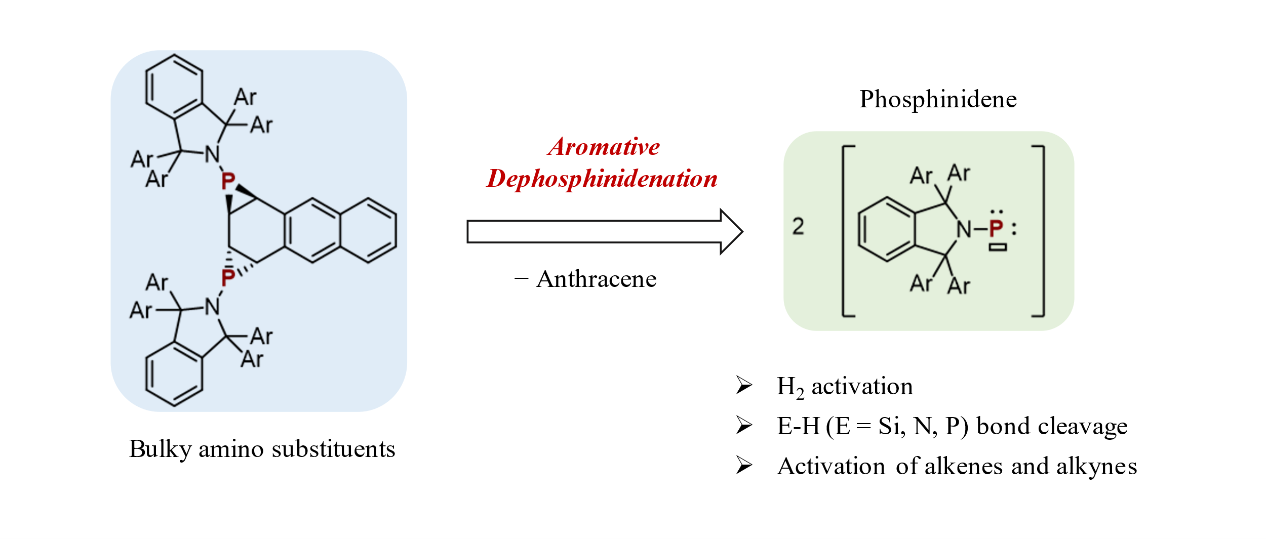 近日,四川大学卢伟课题组报道了一例双磷杂环丙烷并蒽衍生物的合成,该化合物可看成是胺基膦宾中间体与蒽发生[1+2]环加成反应的产物。在加热条件下发生去膦宾芳构化(逆环加成)反应生成蒽和二分子膦宾中间体,该膦宾中间体可迅速发生分子内异构化。此外研究表明,该化合物可作为胺基膦宾转移试剂活化氢气(H2)和元素-氢键(P-H,Si-H和N-H),以及与烯烃和炔烃等不饱和键发生[1+2]环加成反应,构建多种磷杂环化合物。该工作中,卢伟课题组成功合成了双磷杂环丙烷并蒽衍生物,该化合物可作为新型膦宾转移试剂活化多种小分子,并构建一系列含磷化合物。