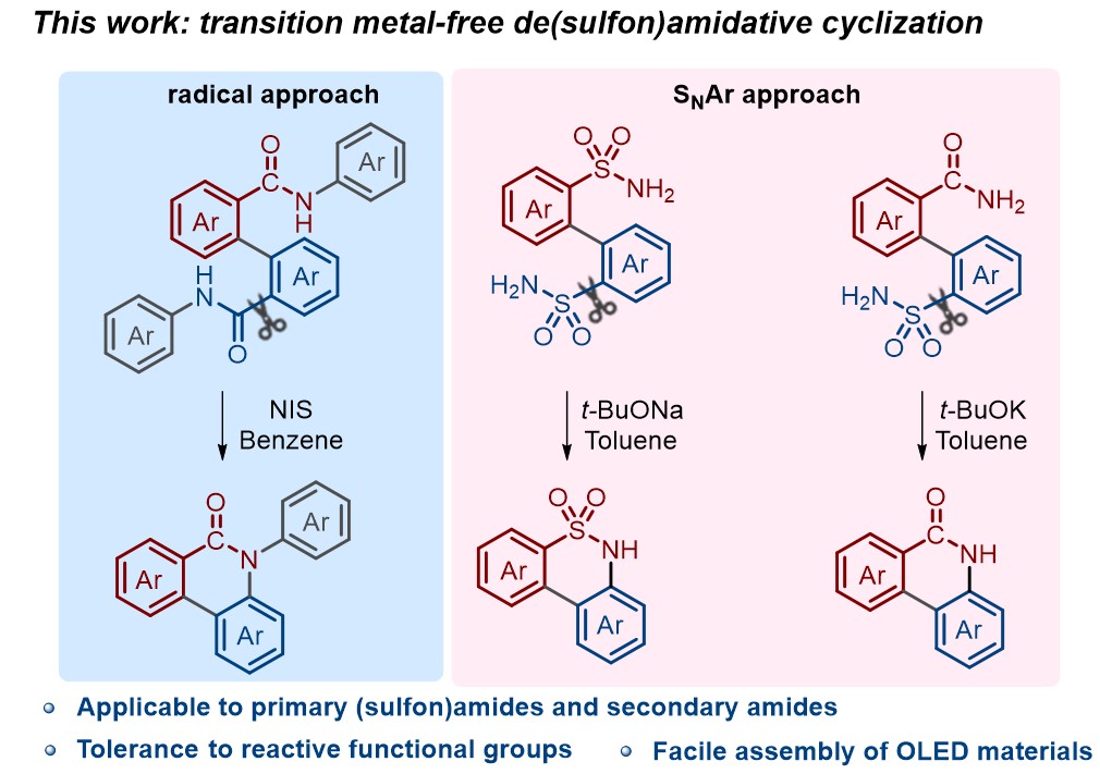 相较于其它羰基类化合物,如羧酸和羧酸酯等,酰胺类化合物由于酰胺键的共振稳定性而活化困难。以往的活化方法主要依赖于过渡金属催化的脱羰官能化反应。该方法通常需要使用具有强给电子能力和空间位阻的配体,以及活性较高的叔酰胺底物。近日,四川大学化学学院的游劲松教授和杨宇东教授团队发展了一种自由基型联芳基二酰胺脱酰胺基环化反应,为直接脱酰胺基官能化方法及二苯并内酰胺衍生物的构筑提供了一种新的途径。沿着这一思路,该团队又开发了基于芳环亲核取代反应机制的联芳基二磺酰胺及同时含有酰胺和磺酰胺基团的联芳基化合物的脱磺酰胺环化反应,实现了一系列二苯并内磺酰胺衍生物和二苯并内酰胺衍生物的构筑。这些方法无需过渡金属的参与,对包含卤素在内的多类反应性官能团具有良好的兼容性。作者将获得的二苯并内酰胺和二苯并内磺酰胺骨架作为受体单元,分别构筑了热活化延迟荧光(TADF)分子DMAC-PDO和DMAC-BTZ。其中,以DMAC-PDO作为发光分子的OLED器件的最大外量子效率(EQEmax)为23.1%。该方法为温和条件下的惰性化学键活化提供了新的途径。