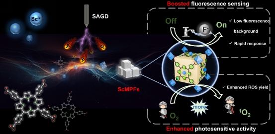 我院郑成斌/张金懿团队提出了一种溶液阳极辉光放电(SAGD)微等离子体,用于一步合成钪-金属卟啉框架(ScMPFs)。SAGD 技术具有操作简单、反应速度快、能耗低、温度低等优点。在等离子体-液体界面提供的大量电子不仅加速了MOFs的快速成核和生长,还促进了离子半径小、配位能力强的钪(Sc3+)掺入卟啉环中的N原子,提高了MOFs的金属化程度。此外,还可以通过调节反应时间和放电气体直接控制 ScMPF 的生长和金属化。较高的Sc3+金属化程度使 SAGD-ScMPFs 表现出优异的光生电子-空穴对分离能力、增强的 ROS 产率和荧光传感能力。随后,SAGD-ScMPFs 被用于灵敏检测水中的F-,并有效抑制了几种革兰氏细菌。这项研究提出了一种快速金属化卟啉 MOFs 的新策略,为合成更广泛的多功能金属卟啉框架提供了重要支撑。