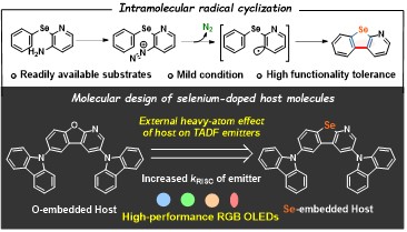 近日,四川大学游劲松教授、宾正杨教授团队和苏州大学陈先凯教授合作,提出了在主体材料中的硒掺杂策略,通过建立高效的自由基环化反应,成功设计并合成了以苯并[4,5]硒吩并[2,3-b]吡啶(BSeP)为核心骨架、双咔唑修饰的双极主体材料DCz-BSeP。与氧基(DCz-BFP)和硫基(DCz-BTP)材料相比,硒的引入显著增强了材料的自旋轨道耦合,使TADF发光材料的反向系间窜越速率提升了三倍,同时优化了双极传输特性。OLED测试结果表明,以DCz-BSeP为主体材料制备的红绿蓝三基色TADF-OLEDs,相较于基于DCz-BFP和DCz-BTP的器件,均表现出更高的效率和更低的效率滚降。此外,该材料在窄光谱红光超敏荧光OLED和磷光OLED中的拓展应用,进一步验证了主体材料中的硒掺杂策略在OLED中的普适性和应用前景,为未来OLED主体材料的开发提供了新的设计思路和方向。