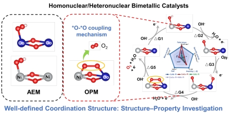 近日,张程课题组与我院刘犇研究员、中国科学院化学研究所张闯研究员、香港中文大学(深圳)Daigo Miyajima教授合作,在游劲松教授的指导下,开发了一种由极性配体组装的双金属共轭配位聚合物单晶材料。极性配体与金属离子的一维聚合组装和二维堆积方式使得材料具有半导体性质、常温顺磁性及低温铁磁性。与近几年报道的非贵金属电催化析氧反应(OER)催化剂相比,该配位聚合物表现出超低过电位及较低的Tafel斜率。其精确的晶体结构为双金属协同催化构效关系研究提供了完美的研究模型,证明OER在异核和同核金属构型之间的反应途径差异,揭示氧化物路径机制在OER中的优势,为构建新型高效电催化剂提供了设计思路。