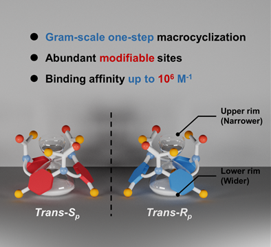 近日,四川大学杨成教授,伍晚花教授和余志鹏教授合作,有廉价易得的非那西丁出发,合成了一种基于Mannich型缩合反应的非那西丁[3]芳烃(Phenacetin[3]arenes,简称Ph[3])的一锅法高效合成方法,建立了亚甲基连接芳胺和芳香碳(NAm-CH₂-CAr)的全新环化路径。由此合成的Ph[3]展现出独特沙漏状结构,双端开口具备丰富的化学修饰性,并在客体作用下展现出有趣的变构调节行为。