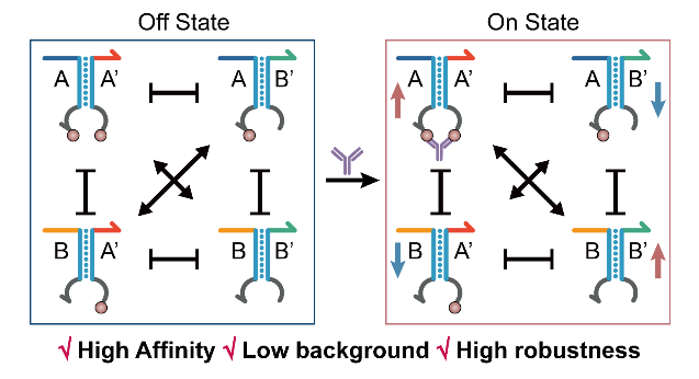 基于邻近效应诱导的DNA自组装是构建快速、免洗脱的蛋白检测传感器的基本原理之一,被广泛应用于超灵敏蛋白检测与原位成像。然而,当前设计策略普遍存在识别亲和力与检测背景之间的内在制约,这是由于较长的DNA互补序列可以通过多价识别提升传感器的亲和力,但会造成过高的背景信号。如何在不增加背景的前提下,提升蛋白识别的亲和力仍然是本领域的一个重要挑战。