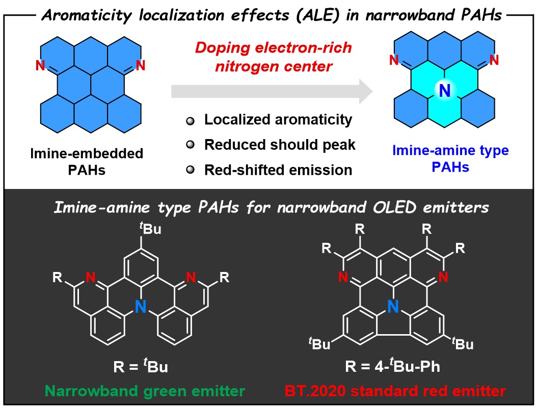 近日,四川大学游劲松教授与宾正杨教授团队在多环芳烃窄光谱荧光材料领域取得重要突破,提出了"芳香性定域效应"(Aromaticity Localization Effects, ALE)这一全新概念,为窄光谱OLED发光材料的设计开发提供了突破性的理论指导。通过系统的理论计算和实验验证,作者证明了多环芳烃分子的芳香性与其发光光谱性质存在显著相关性。具体而言,通过调控多环芳烃分子的芳香性,可有效抑制发光光谱中的肩峰强度,从而实现高色纯度的窄光谱发射,这一发现被定义为"芳香性定域效应"。基于这一理论,通过在团队前期开发的亚胺嵌入的稠杂多环芳烃体系(J. Am. Chem. Soc. 2024, 146, 15977)引入富电子三芳胺氮原子,他们成功构建了独特的"亚胺-苯胺型"多重共振体系。这一分子设计具有以下优势:一方面,通过不同电性氮原子间的多重共振作用,实现了前线分子轨道在氮原子及芳环骨架上的局域化分布,从而在发光中心实现芳香性定域现象,使发光半峰宽得到显著降低;另一方面,三芳胺氮原子的引入增强了分子内的短程电荷转移性质,实现了显著的发光红移,有效解决了传统硼氮共振体系在实现红光发射方面的关键技术瓶颈。基于以上分子设计策略,团队成功开发出一系列窄光谱发光材料,涵盖绿光、黄光至深红光波段。特别值得关注的是,具有芳香性定域特征的II-b化合物表现出优异的深红光发射特性:其最大发射波长达到660 nm,半峰宽仅为35 nm(0.10 eV)。此外,基于II-b的OLED器件实现了符合BT.2020标准的深红光发射,CIE色坐标达到[0.71, 0.29]。这一突破性进展不仅验证了芳香性定域效应的科学价值,更为发展下一代广色域OLED高清显示技术提供了重要的材料基础和技术路径。