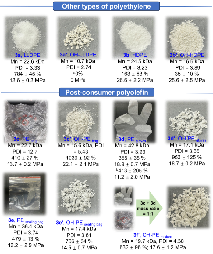 方法适用性探究表明,LLDPE和HDPE处理后分子量下降、机械性能削弱,LDPE及其制品则表现出强度与韧性同步提升,且混合物展现协同增强效应,体现出该策略在LDPE改性与混合塑料回收中的适用性与潜在价值(图3)。