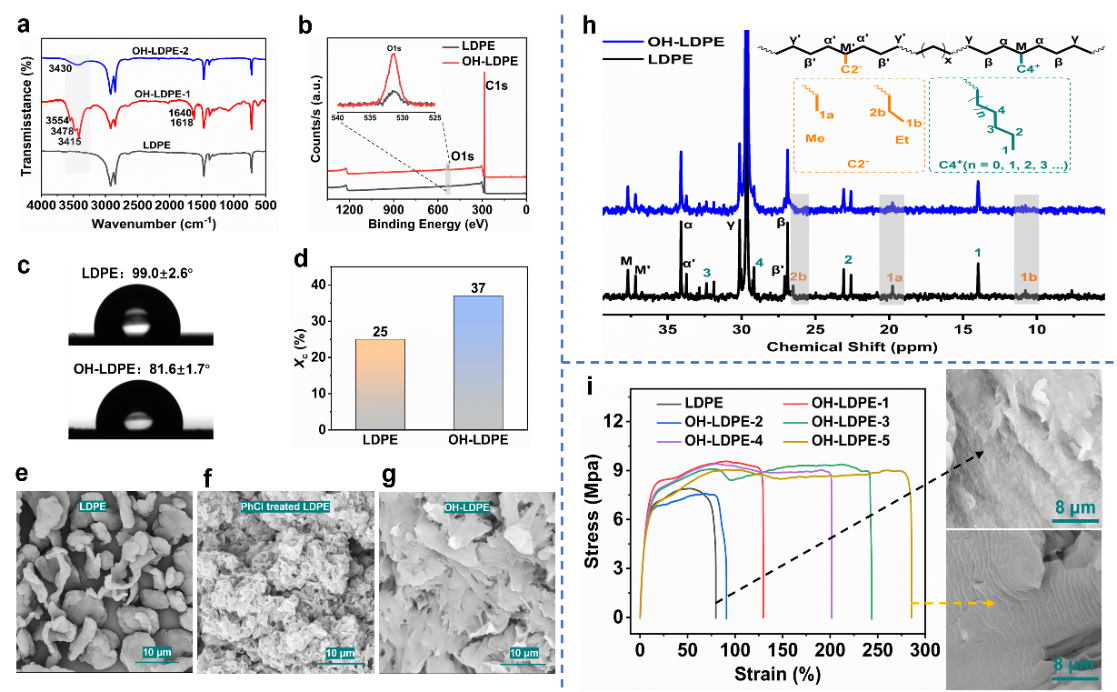 王玉忠团队通过FT-IR、XPS、WCA等表征手段确认了羟基的引入(图2a-2c);通过HT-13C-NMR确认了羟基化LDPE(OH-LDPE)在支链微观结构上的改变(图2h);通过SEM表征了溶剂对LDPE的破碎致孔作用(图2e-2g);通过水接触角(图2c)、XRD(图2d)、单轴拉伸测试(图2i)对OH-LDPE进行了性能研究。其中相比于原始LDPE,OH-LDPE表现出更好的表面润湿性(水接触角由99°降至81.6°)、更高的结晶度(由25%增至37%)及力学性能提升(拉伸强度最高可由7.6 MPa增至9.2 MPa,断裂伸长率由83%提高到280%)。OH-LDPE机械性能增强的原因主要包括:一是羟基的引入促进了链的折叠,提高了结晶度,增强了材料的强度;二是结构变化,如Me-SCB和Et-SCB减少、C4+-CB增加,增强了链的缠结,有利于通过分子链滑动耗散能量,降低局部应力集中,从而提高了材料的韧性和延展性。