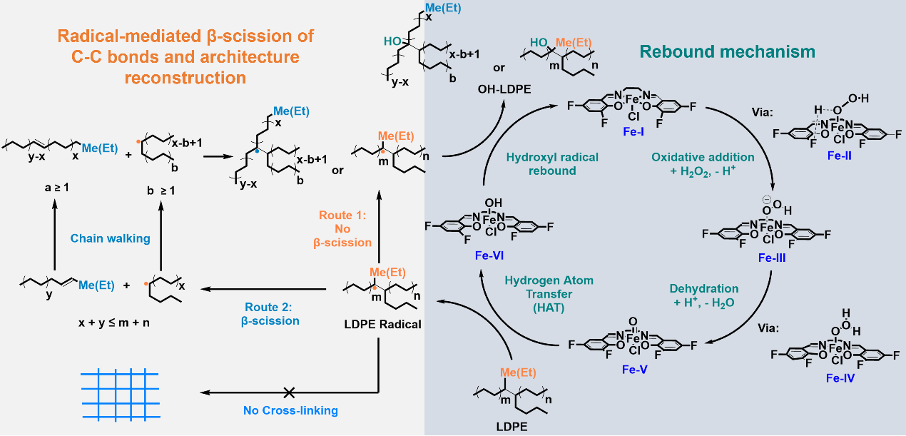 该工作基于含氟配体的Fe(III)-Salen-Cl/H2O2催化体系,实现了LDPE在温和条件下的选择性羟基化与支链重构,显著提升其结晶度、润湿性与力学性能。机制研究揭示催化剂通过增强范德华力、σ-π、氢键的相互作用,并诱导β-断裂—重构机制,克服了氧化导致性能劣化的常规认知,为LDPE的氧化改性与支链结构调控提供了一种新策略。