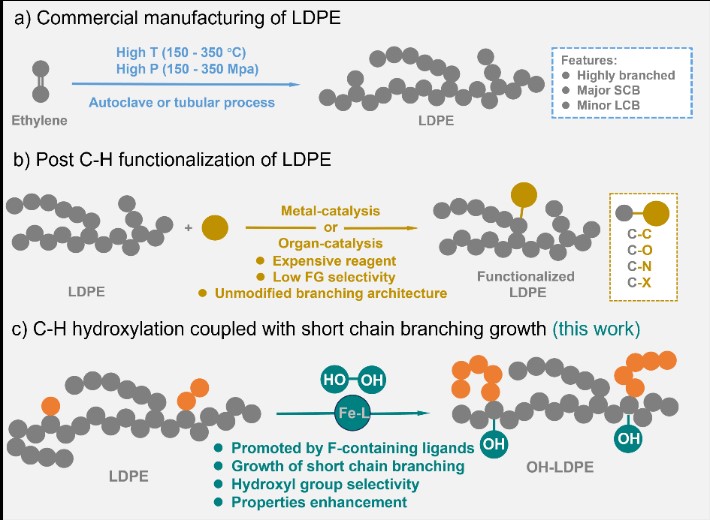 LDPE凭借简单的生产工艺、低成本和化学稳定性,在一次性包装市场占据主导地位。消费后的聚烯烃回收效率低,常被填埋或焚烧,造成严重的环境污染,威胁人类健康。目前LDPE的研究主要存在两个关键挑战。一是调控其支化结构,自由基聚合过程中的链转移反应使LDPE形成包含长支链(LCB)和短支链(SCB)的非线性结构(图1a)。SCB抑制结晶,而LCB改善流变性能,二者的含量对LDPE的加工特性和力学性能影响深远,然而现有调控策略主要针对烯烃聚合过程中催化剂设计,对于已合成的LDPE研究较少。二是开发有效的化学回收方法,虽然催化裂化、氢解、串联催化等方法取得了重要突破,聚烯烃的后C-H官能化也展现出相应潜力(图1b)。