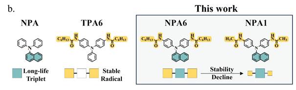 近日,四川大学黄艳教授团队开发了新型光引发剂NPA6(图1)。NPA6在保留了NPA的磷光特性的同时,展现了独特的光生自由基能力(图2),可产生含自由基和中性分子的超分子聚集体。