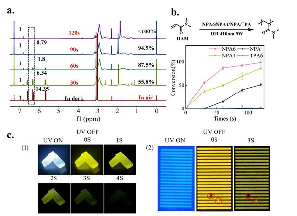 图3. NPA6用作光敏剂的光聚合转化、聚合物余辉及光刻图案
