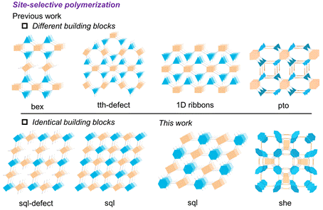 在网格化学中,相同的分子构建块可以通过构象变化形成维度异构体。理论上,相同的分子构建块还可以借助位点选择性聚合,通过反应位点可控的不完全或完全反应,从而形成另一类具有不同维度的框架结构。这类由相同构建块通过位点选择性聚合形成的具有维度差异的结构称为“同源异维框架”。然而,在空间条件受限的情况下,单体分子自身位点的选择性聚合反应很难突破空间的限制以形成这种同源异维框架。