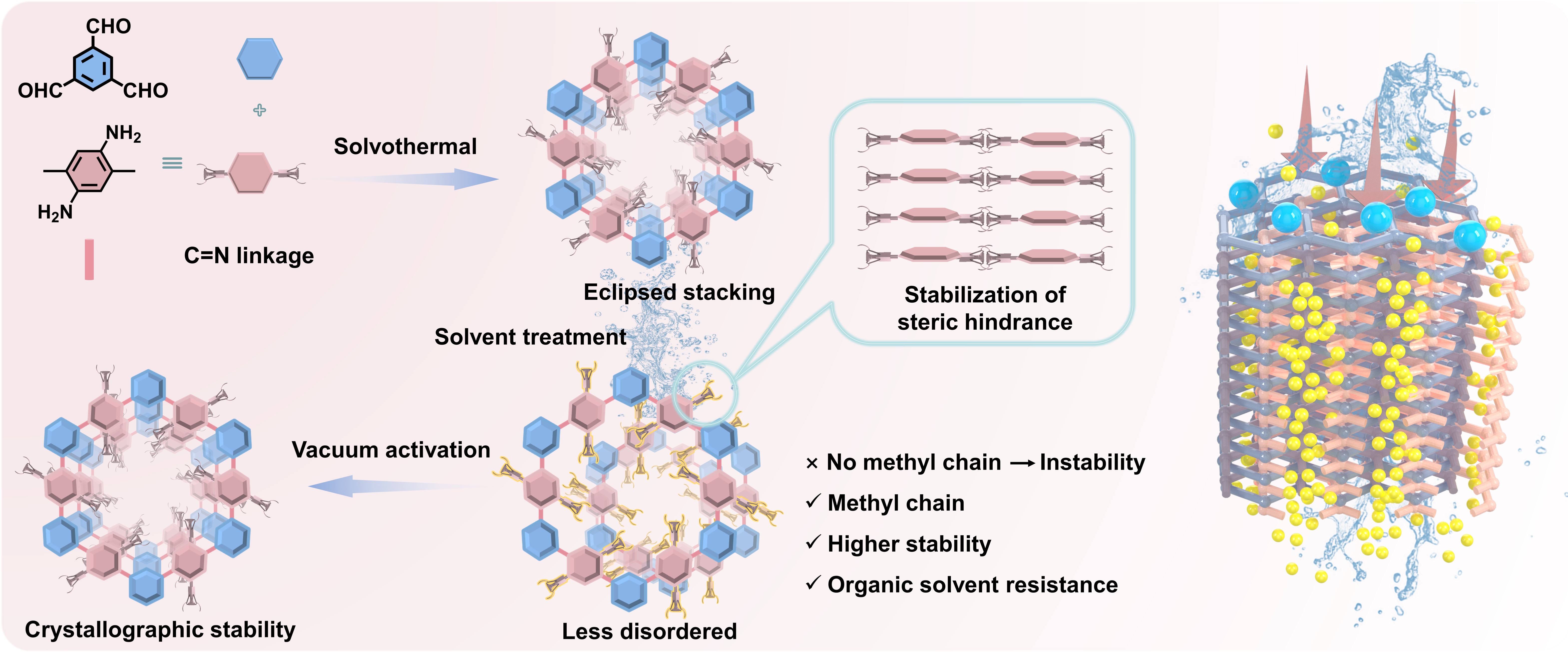 二维共价有机框架膜层间的弱相互作用往往会导致结构无序从而显著影响膜的性能,使得膜分离重现性差,长期性能不稳定。此外,传统的二维共价有机框架膜在溶剂处理过程中常常发生层间滑移现象,从而破坏孔结构的完整性。如何精准调控共价有机框架膜的柔性、无序性和孔径,同时增强其抗溶剂性能,成为突破膜分离性能瓶颈的关键