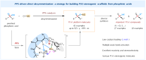 近日,我院王天利教授团队提出"去对称化-衍生化"双模块策略:利用其发展的仿生手性肽季鏻盐催化剂,成功实现次磷酸类分子的精准对映选择性去对称化,高效构建系列手性P(V)-平台分子(图1)。值得注意的是,这些手性P(V)砌块可通过立体专一性转化精准合成多类高值的手性P(V)分子,为结构多样性的手性P(V)化合物提供了模块化合成新途径。