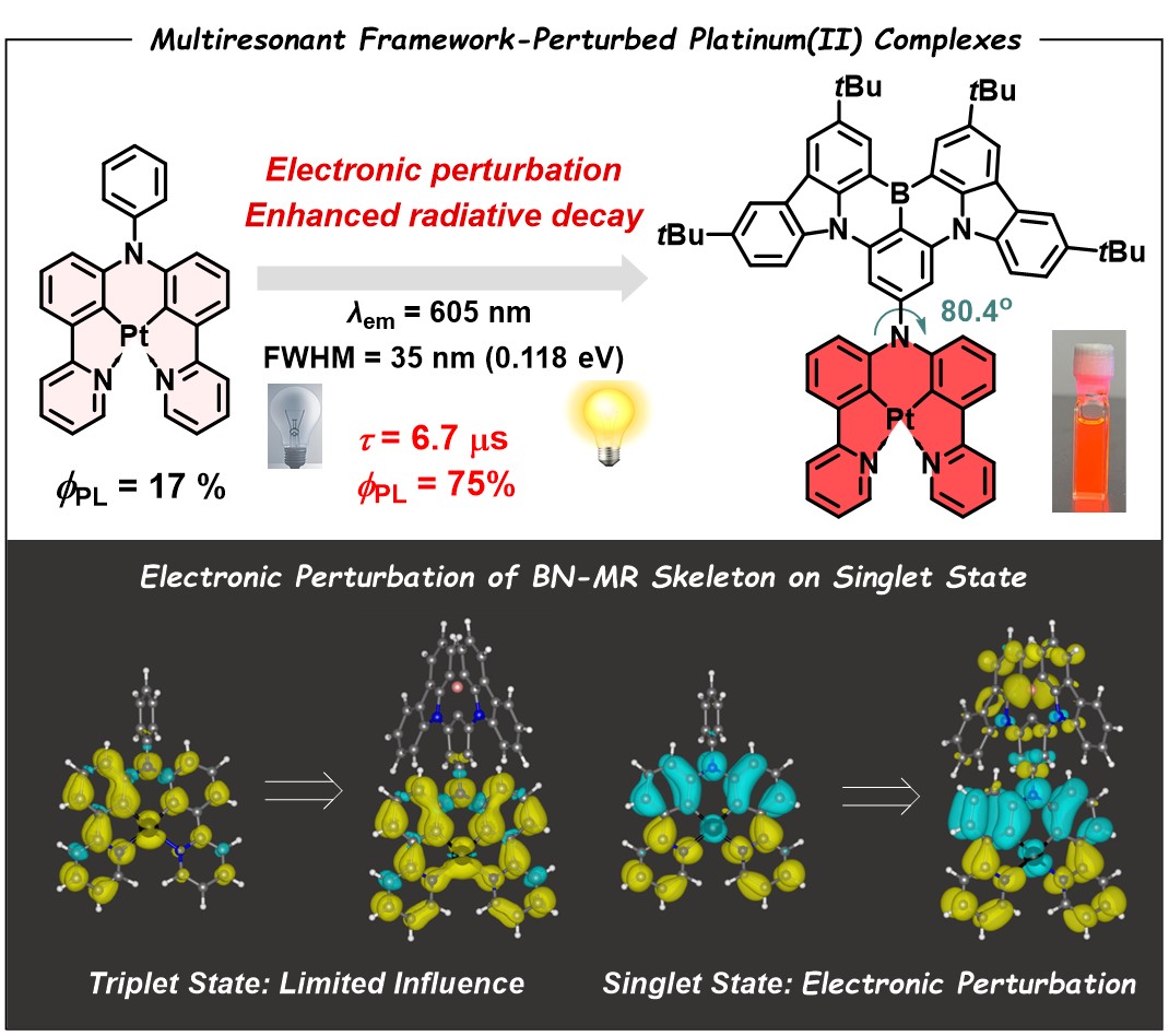 近日,四川大学游劲松教授团队的宾正杨教授、高戈教授与苏州大学陈先凯教授合作,提出了一种利用硼氮骨架对金属铂配合物进行微扰以增强磷光的策略,成功构筑了新型高效窄光谱红光发光材料体系。研究发现,将硼氮骨架与弱发光的铂配合物进行正交结合,可以在基本维持磷光三线态发光波长和半峰宽的前提下,硼氮骨架的单线态强辐射跃迁可有效增强磷光跃迁偶极矩,从而显著提升发光效率。该工作不仅开发了一类新型高效的窄光谱红光磷光材料体系,更揭示了一种基于硼氮骨架与铂配合物微扰的发光增强机制,为发展高性能窄光谱磷光材料提供了新思路。