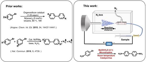 Ullmann偶联反应是构建碳-碳(C-C)键和碳-杂原子(C-N、C-O、C-S)键的重要方法,其传统反应体系通常需要金属催化剂参与,并需在高温(>180℃)和强碱条件下进行。这些苛刻的反应条件不仅导致较高的能源消耗,更限制了该反应类型的普适性应用。因此,开发温和条件下无需催化剂的Ullmann偶联新策略具有重要的研究价值和应用前景。近年来,微液滴化学因其独特的界面特性(如高界面电场 ~109 V/m、局域产生的羟基自由基、极端pH和部分溶剂化效应)成为加速或驱动化学转化的新兴平台。鉴于C-X键的极性以及Ullmann偶联反应中已建立的自由基机制,微液滴化学有望为室温、无催化剂条件下实现Ullmann偶联提供新途径。