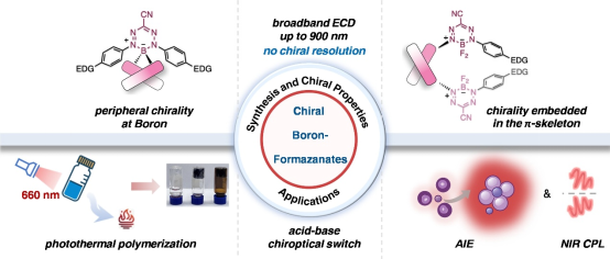 虽然甲臜衍生物早在一个世纪前就作为染料分子被制备,其手性衍生物却从未被报道。四川大学肖啸团队利用甲臜分子的近红外光响应能力,成功设计并合成了一系列手性硼甲臜盐分子,首次实现了光学纯手性硼甲臜盐的制备,且无需手性拆分。研究发现,这些分子不仅具有高效的近红外吸收与发光、宽圆二色(CD)响应和优异的光热转换性能,还能在酸碱刺激下实现可逆的圆二色信号切换,部分体系还展现出近红外圆偏振发光(CPL)特性。该工作不仅首次实现了手性甲臜类染料的光学纯合成,更通过模块化策略构建了一个多功能近红外手性平台,为发展下一代手性光电子材料、生物探针和智能响应器件提供了新思路。