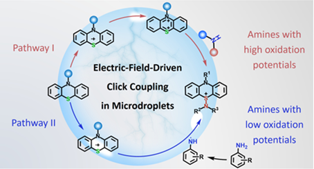 相关工作以“Electric-Field-Driven Dual-Pathway Click Coupling of Phenothiazines and Amines in Aqueous Microdroplets”为题发表在Journal of the American Chemical Society,四川大学为第一单位,化学学院蔡镇锋研究员和刘沁蕾副研究员为该论文共同通讯作者,硕士研究生邹羽同学为论文的第一作者。感谢国家自然科学基金委、四川省科技厅、四川大学的经费支持。感谢四川大学化学学院周月雯同学和谭娟同学在电场测量中提供的帮助。