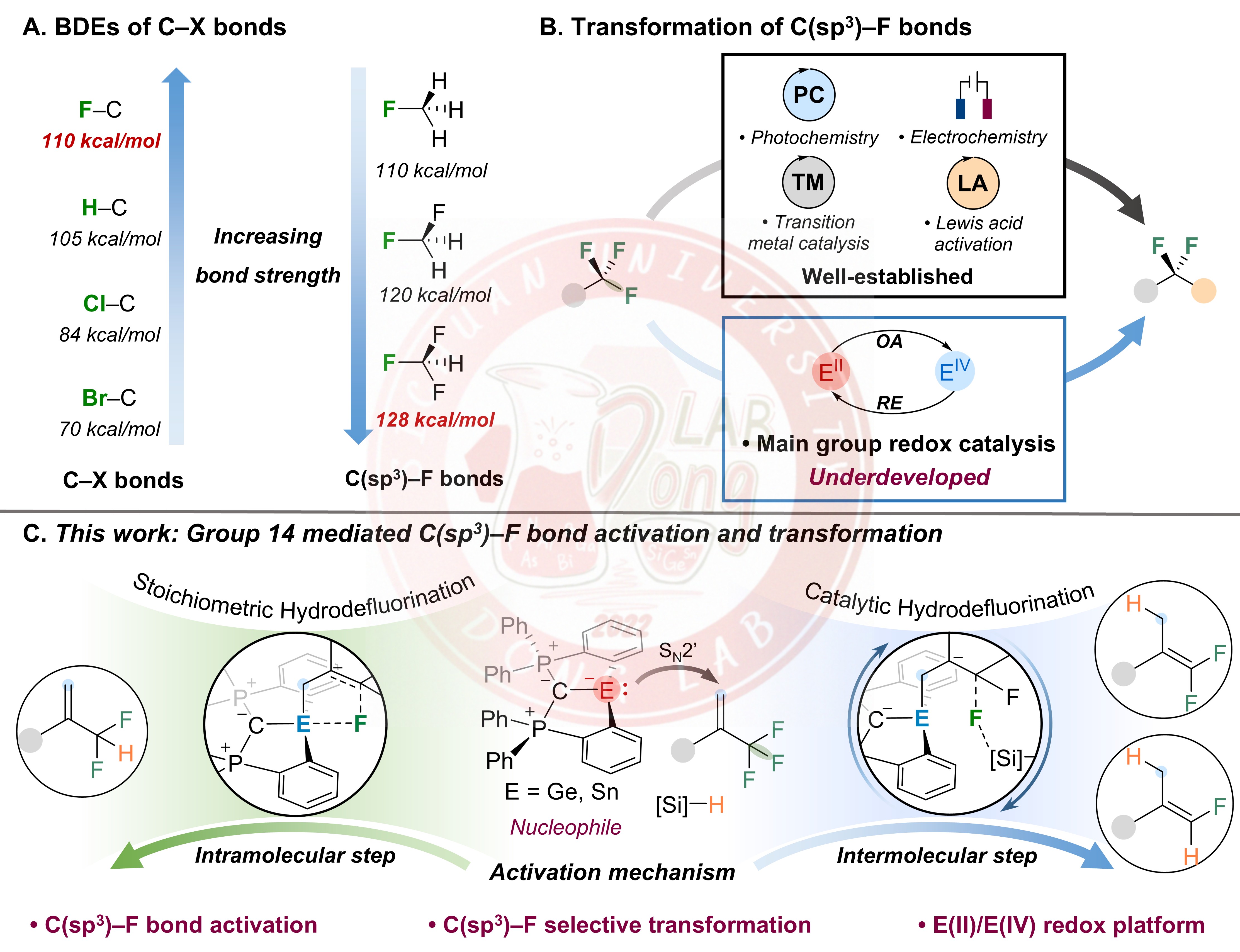 三氟甲基中C(sp3)−F键具有极高的键能,其选择性活化和可控转化是有机氟化学领域的长期挑战。近年来,四川大学董召文课题组聚焦于具有准金属特性的低价重十四族元素试剂的精准合成与催化性能研究。围绕“低价锗、锡变价催化”这一关键科学问题,通过创新配体设计与合成策略,成功开发了多种结构新颖的低价锗、锡试剂,并率先构建了基于Sn(II)/Sn(IV)、Ge(II)/Ge(IV)及Ge(II)/Ge(III)/Ge(IV)变价循环的主族催化新体系(Angew. Chem. Int. Ed. 2026, e7786614; J. Am. Chem. Soc. 2025, 36752; Angew. Chem. Int. Ed. 2025, 64, e202515638; Nat. Commun. 2024, 15, 9849; JACS Au 2025, 5, 1289; Inorg. Chem. 2026, 65, 2060)。然而,利用低价主族化合物实现C(sp3)−F键选择性催化活化至今仍未实现突破,仍是该领域亟待解决的重要科学难题。