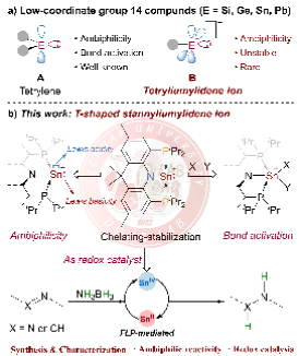 长期以来,现代合成化学的发展高度依赖过渡金属配合物,其丰富的配位模式与可变的氧化态为化学键活化与催化转化奠定了重要基础。然而,随着过渡金属资源日益稀缺、成本持续攀升及环境问题日益凸显,发展储量丰富、环境友好的主族催化剂已成为可持续催化化学的重要研究方向。围绕“低价锗、锡变价催化”这一关键科学问题,本课题组通过创新配体设计与合成策略,成功开发了系列结构新颖的中性钳形二价锗、锡催化剂,率先构建了基于Ge(II)/Ge(IV)、Ge(II)/Ge(III)/Ge(IV)、Sn(II)/Sn(IV)及E(II)/E(IV)=O (E = Ge, Sn)变价循环的主族催化新体系,实现了惰性化学键的高效活化与精准转化(Angew. Chem. Int. Ed. 2025, 64, e202515638; J. Am. Chem. Soc. 2025, 147, 36752; Nat. Commun. 2024, 15, 9849; JACS Au 2025, 5, 1289)。尽管中性二价锗、锡催化体系已在变价催化中展现出良好潜力,但有关阳离子型二价锗、锡配合物的合成与催化应用仍面临严峻挑战。其核心难点在于中心十四族元素具有更高的路易斯酸性,导致其稳定性更差。因此,如何实现阳离子型二价锗、锡物种的有效稳定,并充分释放其在变价催化中的潜能,已成为该领域亟待突破的关键科学问题。