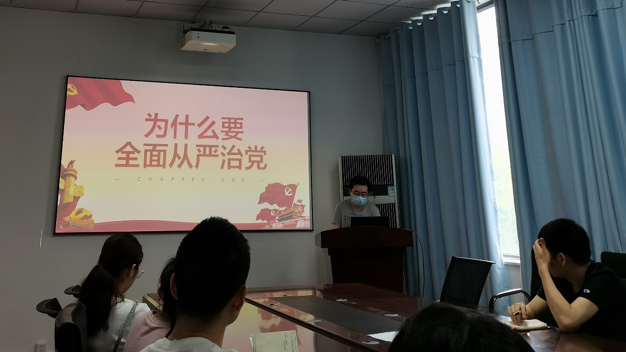 支部副书记成锐从为什么要全面从严治党、全面从严治党的历史沿革、全面从严治党治什么、全面从严治党怎么做这四个方面为大家做出详细介绍,由世情、国情、党情的空间维度,几代领导人治党方针的时间角度,生动地讲述了全面从严治党的必要性。作为新时代青年党员,我们应当认识到从严治党离我们并不遥远,这亦是我们的行为准则,我们应以“四大纪律”、“八项要求”严格要求自己,做到遵纪守法、廉洁自律。