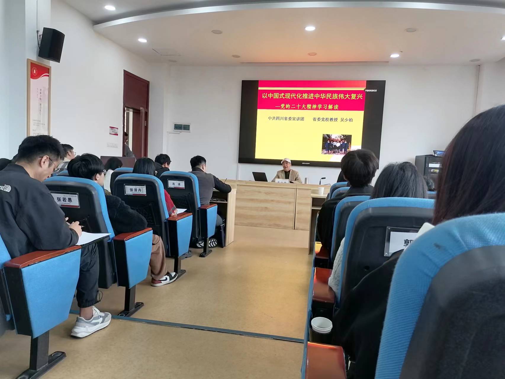 本次培训班邀请到四川省委党校四川行政学院吴少柏教授,作《迈步新征程,奋力建设现代化强国,推进中华民族伟大复兴——党的二十大精神学习》专题讲座。吴教授从民族复兴的伟大进程、“两个确立”的决定性意义、“三个务必”的丰富内涵、中国式现代化的内容等方面对党的二十大精神进行了深刻全面的解读。