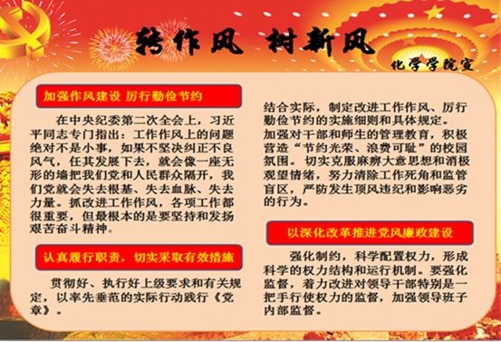 为贯彻落实《中纪委、教育部、监察部关于加强高校反腐倡廉建设的意见》、《四川大学2014年党风廉政建设工作要点》和《关于开展2014年党风廉政教育宣传月活动的通知》,化学学院以加强党员干部作风为主线,紧紧围绕学校“转作风,树新风”的活动主题,结合实际,突出重点,精心组织,周密安排,扎实深入的开展一系列党风廉政教育宣传月活动,并取得了明显成效。